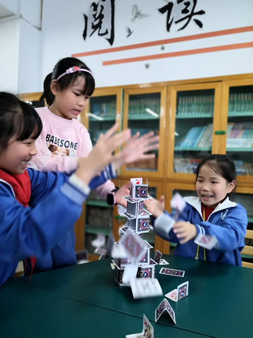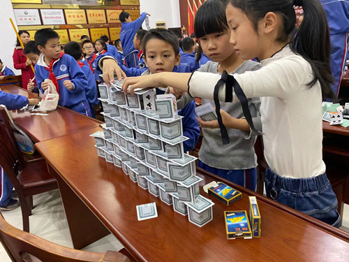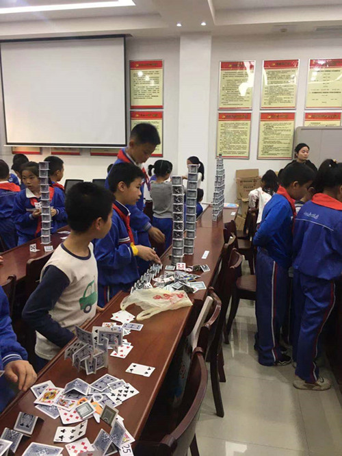 据该校科技辅导员余老师介绍,“趣味扑克牌搭塔”活动是一项集动手、动脑、娱乐于一体的游戏。它是对学生规划设计能力、动手实践能力、相互配合能力、创新意识及综合素质的一次挑战和考验,同学们可以把平时在课堂上或课外阅读中学到的结构规划、设计、创新思维运用其中,通过小组合作的方式,体验用扑克牌设计高塔的过程。