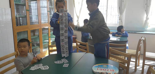 随着裁判工作人员一声令下——“预备,开始”,比赛也正式拉开了序幕!同学们迅速拿出扑克牌,快速的折叠或剪,小心翼翼地搭建。活动期间充分体现了小伙伴们分工、合作的精神,一个折或剪,一个叠,一个实时查看或辅助。时间在一分一秒中过去了,“塔”也一层一层地升高了。比赛现场时常响起“哎”的一声叹息,又经常有一声“没关系,我们重新搭”。随之而来,三个小伙伴就这样互相安慰、互相鼓励、毫不气馁,没有轻言放弃,而是努力地向着胜利前进。