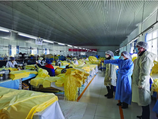 工行强化担当、主动作为,全力以赴用金融服务支持中部地区疫情防控重点保障企业,全面实施支持企业复工复产。图为湖北荆门分行屈家岭支行客户经理深入生产防护衣、口罩等防疫物资的荆门某医卫公司调查生产经营情况。