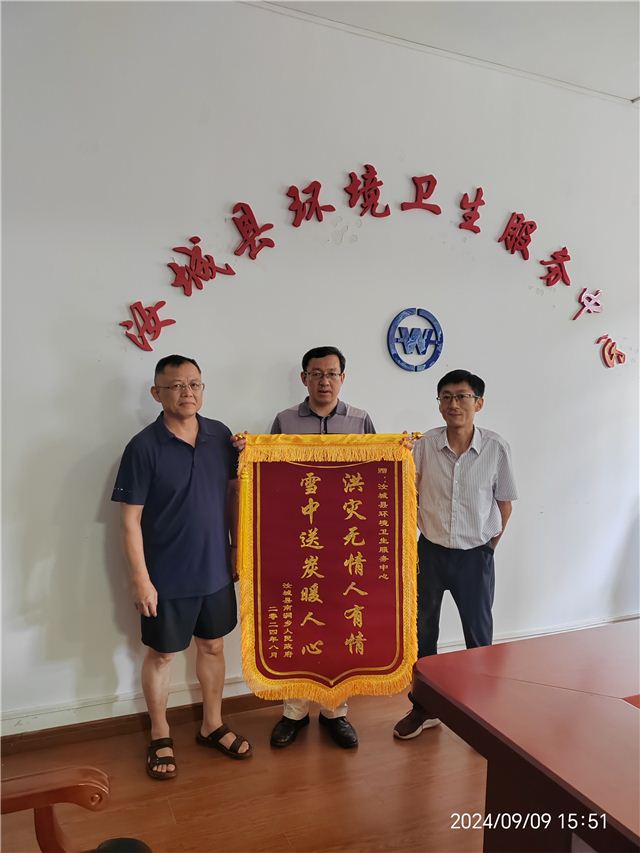 9月9日,湖南省汝城县南洞乡人民政府将一面印有“洪灾无情人有情 雪中送炭暖人心”的锦旗送到了汝城县环卫中心,对该中心在抗洪救灾中所做的工作表达了高度赞扬和诚挚感谢。