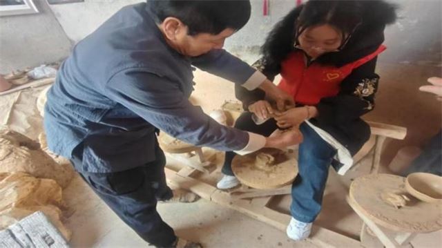 在臧家庄镇非物质文化遗产传承实践点,学生代表团拜访了“砂大碗”制作技艺传承人孙德民先生。孙先生向学生们系统讲解了从选土、练泥到拉坯、烧制的完整工艺流程,并指导学生亲手体验了陶器制作的关键环节。一块块质朴的陶土在指尖逐渐成形,让学生们深刻感受到传统手工艺所蕴含的匠心与智慧。