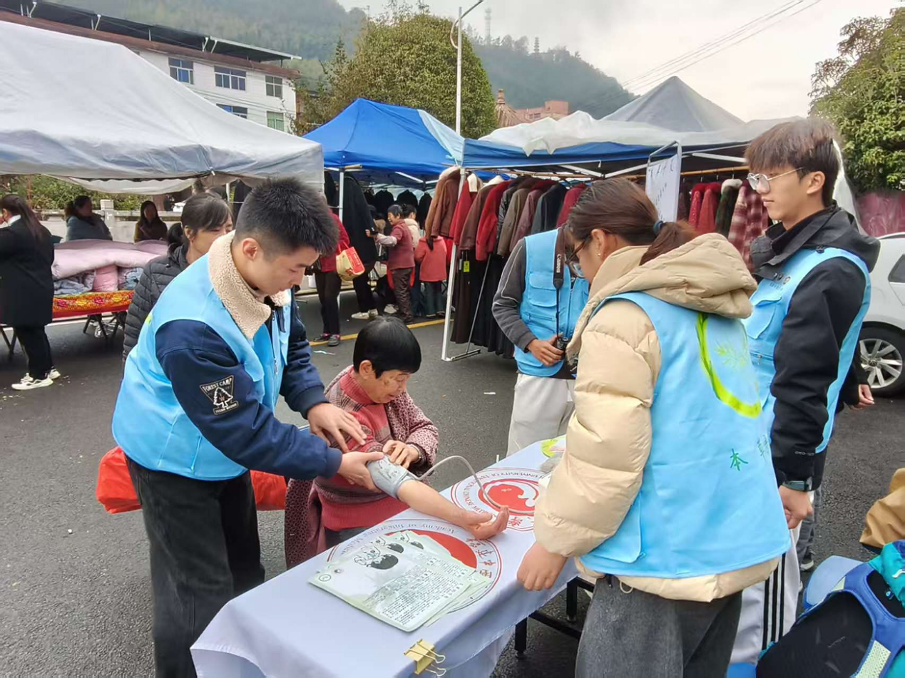 实践最后一站,团队走进塔前镇开展科普宣讲与健康服务。在镇文化广场,队员通过实物展示、图文展板等形式,向居民介绍艾草药用价值及家庭使用方法,并提供免费血压测量服务。两小时内累计服务村民62人,筛查血压异常者17人,发放自制科普手册100余份。活动间隙,团队还设立资助政策咨询点,发放政策卡20余份,现场解答助学贷款、奖助学金等疑问,帮助3名家庭经济困难学生初步了解申请流程。