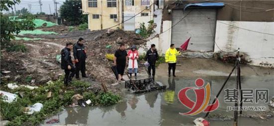 街道办事处主任杜洋到火神阁子查看积水排泄情况。