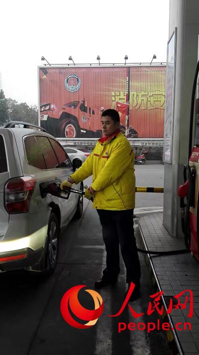 中国石油陕西安康销售分公司三桥加油站工作人员正在给私家车加油。(人民网 朱江 拍摄)