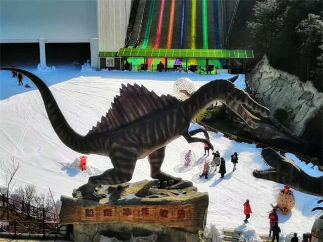 景区负责人赵志丹说,这是景区刚刚于几日前开放的恐龙冰雪世界室外滑雪场:从今年10月15号开始,奥陶纪景区便引入西南最先进的三套造雪设备,秘密开始了造雪工作,至今,已经形成了半室内1万平米加室外3000平米的超大雪场。其中,半室内的滑雪场由原恐龙冰雪世界加盖而来,是为了可以确保在气温20度以上都能玩雪。而室外的3000平米雪场则是几天前刚推出的,让游客可以真实体验室外沐雪的神奇体验。如今,室外雪场的积雪深度已达1米多,这座滑雪场不受天气影响,不受温度影响,随时都能玩雪,这在中国众多滑雪场中,尚属独一家。