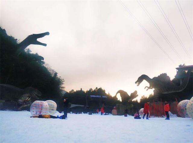 记者注意到,当日景区内升起了山中的薄雾,雾气笼罩的同时,雪场已被一团白皑皑的雪覆盖,旁边的“恐龙”正在雾中探出头来,摇晃嘶吼着,白雪、山雾和恐龙交织在一起,放佛让人穿越到一个平行时空。来自全国各地的游客,正在雪场内尽情地戏雪、滑雪。