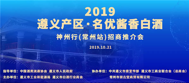 由中国酒类流通协会、遵义市人民政府指导,遵义市工业和能源局、遵义市白酒行业商会主办,中共遵义市委宣传部、遵义市工商业联合会、常州市崇古堂商贸有限公司协办的“2019遵义产区·名优酱香白酒神州行(常州站)招商推介会”将于10月21号在常州市听松楼花园酒店多功能宴会厅举行。这次活动的目的在于以酒为媒、共谋蓝图,助推遵义白酒产业健康快速发展。