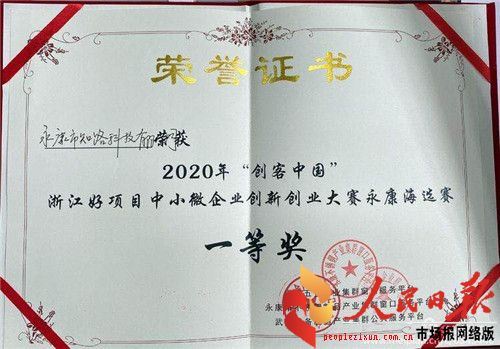 在办公室书架上放着一本荣誉证书。今年6月26日,该公司参加"创客中国·浙江好项目中小微企业创新创业大赛永康海选赛",荣获一等奖。