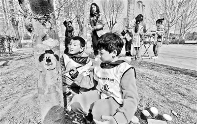 在植树节即将到来之际,史家小学五年级4班和二年级17班的二十余名同学来到朝阳区泛海国际社区的中心花园,为这里的一棵棵小树“穿上花衣”。