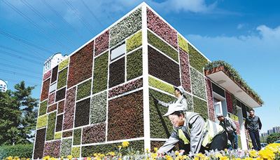 5月3日,北京市丰台区花乡草桥村环卫工人们正在对新建成的“花房式公厕”进行管护。为提升公厕服务品质,以花卉为主导产业的草桥村将绿色、卫生和美观的理念融入到公厕的建设之中,该公厕的四边外墙和房顶均由绿雕墙构成,从侧面看整个房子像是五颜六色的大魔方。