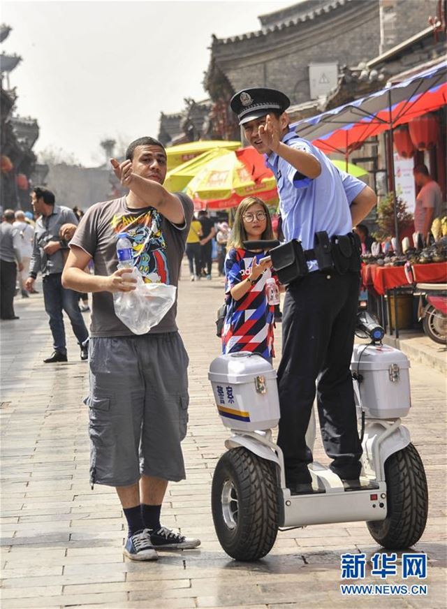 今年5月初,山西省晋中市平遥县公安局古城旅游警察大队配备了警用巡逻平衡车,提高了执勤效率,更好地服务古城游客。新华社发(梁生仁 摄)