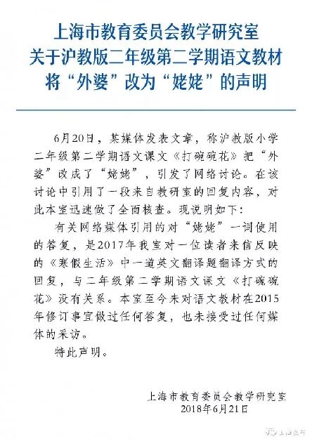 上海市教育委员会教学研究室今日发表关于沪教版二年级第二学期语文教材将“外婆”改为“姥姥”的声明。声明称,网络媒体引用的答复,是2017年研究室对一位读者来信反映的一道英文翻译题翻译方式的回复,与二年级第二学期语文课文《打碗碗花》没有关系。