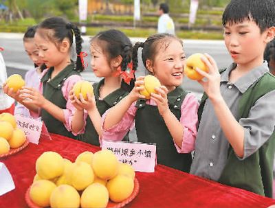 7月1日,浙江省湖州市吴兴区在妙西镇原乡小镇举办鲜桃大会,展示鲜桃评比大赛的优胜品种,并组织游客现场采摘、举办少儿画桃大赛等,推介当地的鲜桃品种。图为小朋友们在参观鲜桃评比大赛的优胜品种。