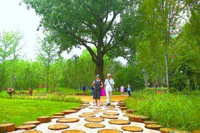 此外,公园还建设了海绵绿地。林下广场采用园林树木修剪下来的树枝打碎压制而成的新型环保铺装,具有无毒、透水、可降解等优点,相比传统铺装材料脚感更舒适。同时,利用卵石沟、生物滞留池等形成集雨绿地,发挥海绵效应。