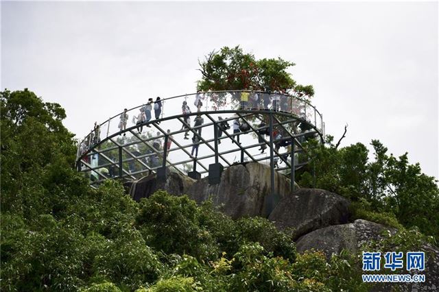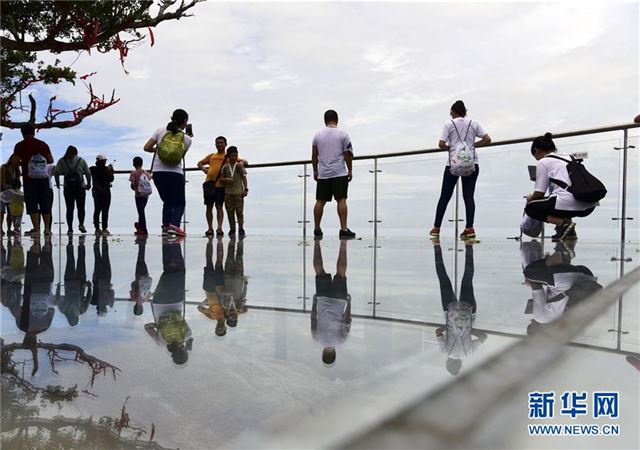 7月29日,在海南三亚亚龙湾热带天堂森林公园,人们在海景玻璃栈道上观光。 新华社发(沙晓峰 摄)