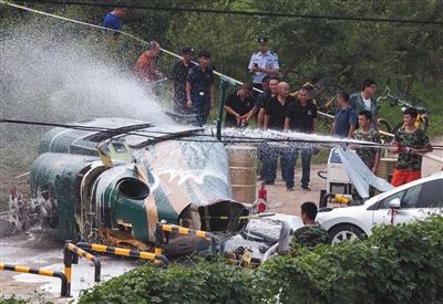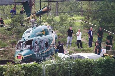 7月30日上午,京承高速吉祥寺桥下与顺白路交叉口,沿河道西侧奶东公园内停车道往北100米处一架民用直升机坠落。下午工作人员将管子伸入机身引流航空煤油。