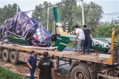 吊车吊起成功后,用塑料布盖住机身,等候拖运。
