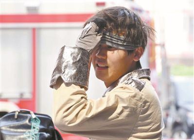 昨日立秋。“秋老虎”为广州带来酷热的天气,扮演“大灰狼”的演员在烈日下工作。