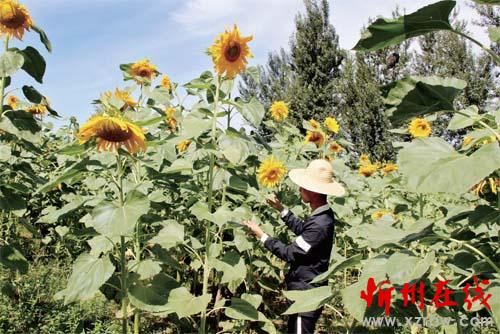 原平市因地制宜,利用坡梁地发展葵花等小杂粮种植,并创新管护模式有效促进农民增收。图为8月21日原平市解村乡北岗村农民正在对向日葵进行田间管理。