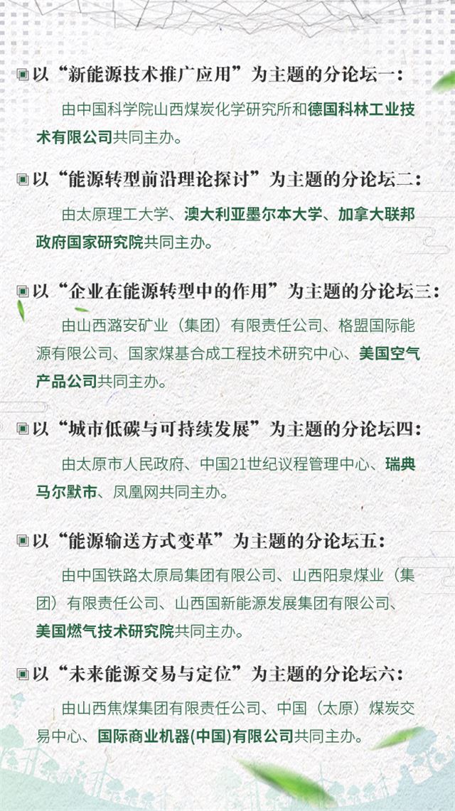 据悉,由山西省人民政府与科技部、商务部、国家能源局共同主办的太原能源低碳发展论坛包括一场高峰论坛、六场分论坛、一场国际合作会议。