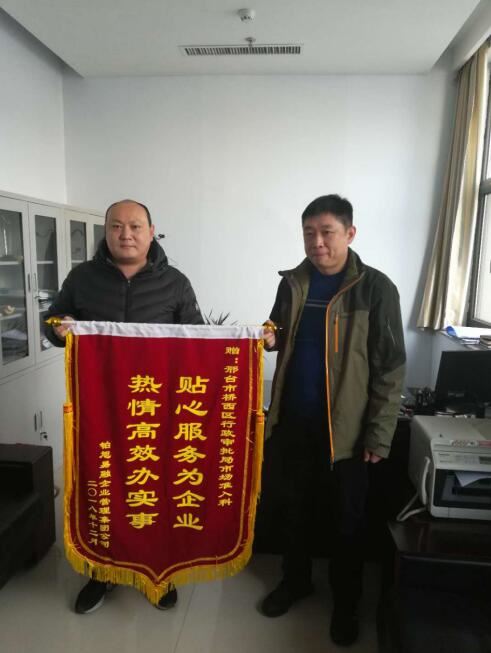 近日,河北铂旭易融企业管理集团有限公司到营业执照办理窗口申请办理营业执照变更业务,了解到铂旭易融公司在经营中遇到了资质办理困难,导致多项业务无法开展的实际情况后,窗口人员积极指导企业准备全部资料,急企业之所急,特事特办,本着为企业服务好的宗旨,就该企业实际问题,多次与邢台市审批局请示和沟通,最终为企业办理了变更登记并当场办法发营业执照。为表示感谢,公司负责人将一面写着“贴心服务为企业、热情高效办事实”的锦旗送到邢台桥西区行政审批局,衷心感谢窗口工作人员对铂旭易融公司的帮助与支持。