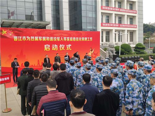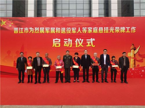 2019年2月2日,福建晋江市在全省县(市、区)中率先举行为烈属军属和退役军人等家庭悬挂光荣牌工作启动仪式,并由晋江市领导带领光荣牌悬挂小分队深入60多户重点优抚对象“三属”家庭中悬挂“光荣之家”牌匾。这一举措,褒扬彰显了军人为党、国家和人民牺牲奉献的精神风范,让广大烈属、军属、现役军人、退役军人感受了党和政府的关心和温暖,为实践“让军人成为全社会尊崇的职业”的诺言、进一步推进军人荣誉体系建设做出了积极的贡献。