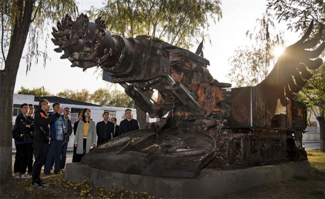 游人在榆林中能文创园原煤矿区参观原采煤设备改造的艺术雕塑 陶明摄