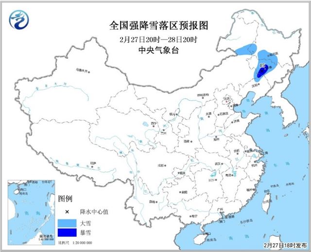人民网北京2月27日电 据中央气象台网站消息,中央气象台2月27日18时发布暴雪蓝色预警: