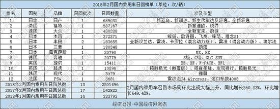 根据国家质检总局缺陷产品管理中心2月份发布的召回公告,经济日报-中国经济网汽车频道经过汇总、统计,整理出“2018年2月国内乘用车召回榜单”。2月,国内乘用车市场共有12个品牌发布13次召回公告,累计召回汽车2501496辆,同比增长360.83%,环比增长649.42%,召回数量飙升。