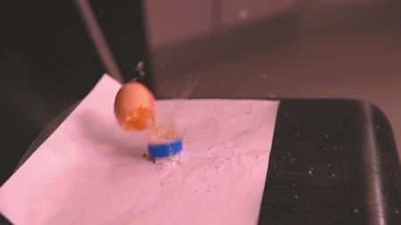 首先,射击最脆弱的鸡蛋,一扣动扳机,一秒之内,至少连续击发了6发,结果鸡蛋瞬间被打爆,甚至被击飞跳了起来。