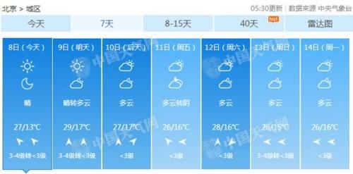 今明两天京城将继续维持晴好天气,北京市气象台预计,今天上班时晴间多云,北风二级,气温为13-19℃;白天晴间多云,北风二级转南风三四级,最高气温27℃;夜间晴间多云,最低气温13℃。明天晴转多云,最高气温将升至29℃,最低气温也升至17℃。