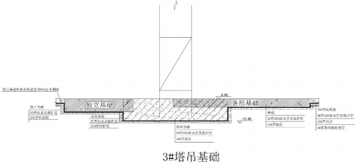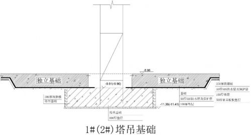 基于此,中建二局金地玺悦府项目设计为塔吊基础顶标高平齐筏板(独立)基础。塔吊基础与周边筏板(独立基础)同时施工,防水层从基础底部整体穿过,有效避免了塔吊标准节处的存水隐患,且基础防水不用预留甩茬,一次性施工完毕,消除了防水薄弱点。
