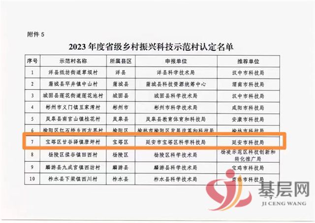 中国基层网讯(通讯员:马文丽)日前,省科技厅认定了2023年度农业农村领域省级科技创新平台,省级乡村振兴科技示范村名单出炉,延安市宝塔区甘谷驿镇唐坪村榜上有名。