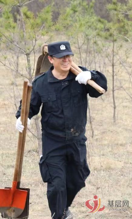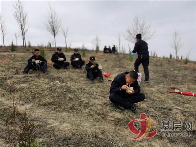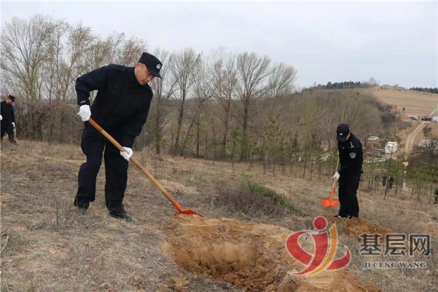 植树现场,全体民辅警跃跃欲试,干劲十足,齐心协力,挥汗奋战。