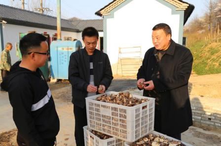 赵清林(右一)与香菇种植技术员交谈