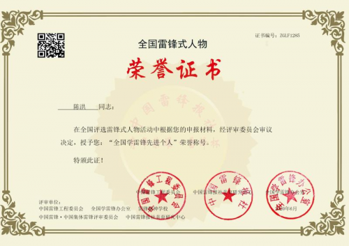 2020年6月,陈洪同志被中国雷锋工程委员会、中国雷锋报社、全国学雷锋办公室、中国雷锋报社美育研究中心、中国雷锋·中国集体雷锋评审委员会授予“全国学雷锋先进个人”荣誉称号。