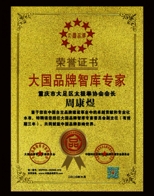 【人物介绍】周康煜,男,汉族,生于1968年6月,重庆市大足区金山镇人,中共党员,大足区政协委员,中国国学文化武学传承委员会委员。陈式太极拳第十二代传承人,大足区武术协会主席,大足区专家组成员。中国太极拳联合会授予“太极八段”,带领的太极团队被世界太极拳网和中国太极拳网授予“世界最有影响力的太极机构”和“全国十佳太极团队”称号。本人2019年参加评全国的评选活动获得中国太极拳传承推广突出贡献奖。2015年被重庆市体育局授予“好体育人”,2017年被重庆市文明办、市网信办、市体育局联合授予2017年度“最美好体育人”称号。2019年春节被中央电视台记录栏目组邀请代表武术界向全国和海外的武术爱好者拍新春贺岁片,在海外和全国各网络频道发布。近年来,代领大足区的武术健儿参加世界传统武术锦标赛、全国的传统武术精英赛、重庆市的传统武术英赛获得三百多枚金牌,本人也获得二十多枚金银铜牌。2020年6月,由中央电视台栏目组推荐申请加入了大国品牌智库专家,2020年被中国影响力数据库、CCTV决策中国栏目组、名人百科平台授予一2020年时代项业先锋人物。