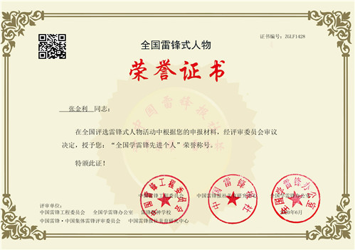 2020年6月,张金利同志荣获“全国学雷锋先进个人”荣誉称号。该荣誉称号由中国雷锋工程委员会、中国雷锋报社、全国学雷锋办公室组织评选、授予,是对张金利同志热心公益,积极参与社会志愿服务事业的充分肯定和认可。