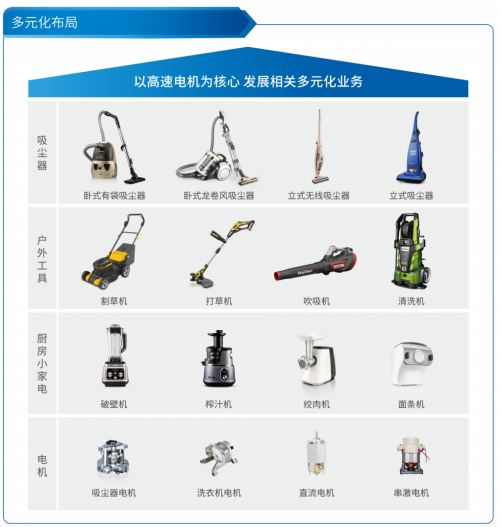2005年开始围绕电机这个核心技术,发展相关多元化业务,包括园艺工具、厨房小家电。