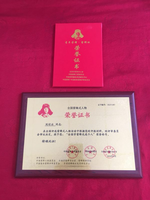 近日,刘付云同志经过层层严格审核评审,荣获由中国雷锋工程委员会(由全国总工会批准成立)、中国雷锋报社(由全国人大常委会原副委员长彭佩云任荣誉社长、中共中央组织部原部长张全景任社长)、全国学雷锋办公室(经中组部、中宣部、团中央、教育部联合批准)、中国雷锋报社美育研究中心、中国雷锋·中国集体雷锋评审委员会授予全国雷锋式人物——“全国学雷锋先进个人”荣誉称号和“青年荣耀”勋章,这是对刘付云同志热心公益,积极参与社会志愿服务事业的敬业精神和无私奉献精神的肯定及认可。