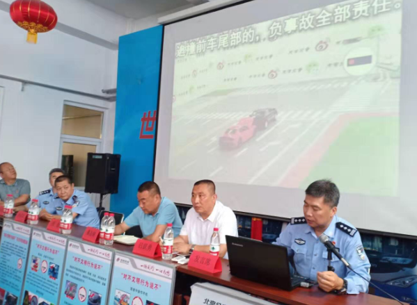 北京双桥交通队三位民警利用视频和生动的讲解,对疲劳驾驶、行车看手机、行车斗气等行为逐一进行分析。民警播放的视频与分公司开展的“对不文明行为说不”的活动相互呼应,参加会议的司机员认真观看视频,对民警讲解内容仔细记录。