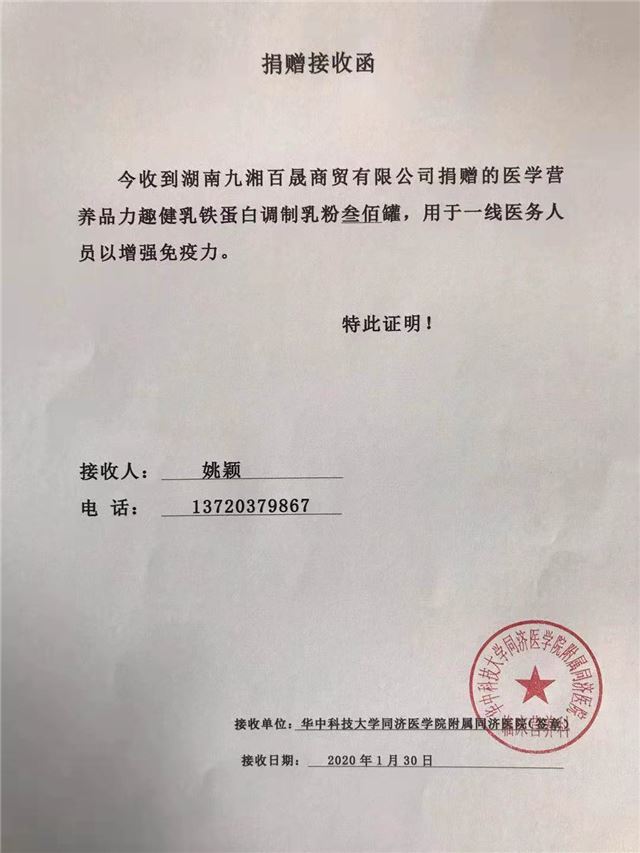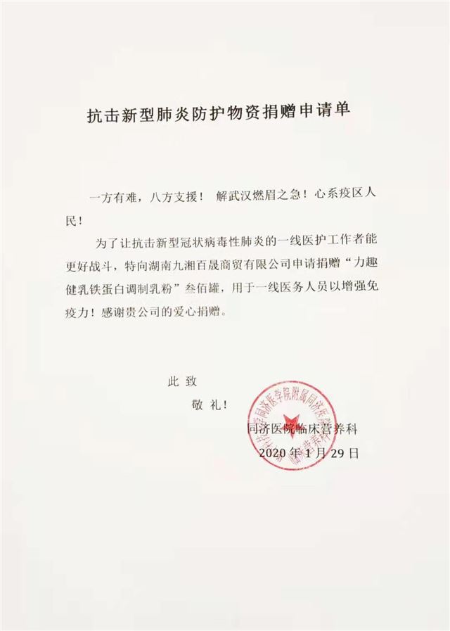 第一批捐赠湖北武汉同济医院临床营养科。在武汉这座抗击新型肺炎最前线的战场上,让医生们在守护大家健康的同时也加强自身营养与免疫,每天能有更多的精力体力去救治更多的患者。