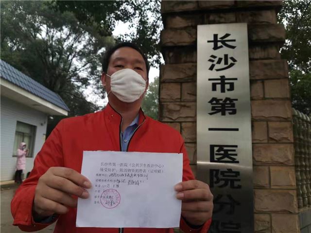 在长沙市公共救治中心大门外,双方交接了这些物资。长沙市公共救治中心综合办公室刘主任代表中心和医院表示了谢意,并向九湘百晟商贸有限公司出具了捐赠证明表。