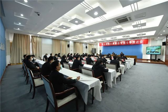 会议在市中院设主会场,各基层法院设分会场,以视频会议形式召开。市中院和各基层法院扫黑除恶专项斗争领导小组全体成员及扫黑办全体人员分别在主会场和分会场参加会议。