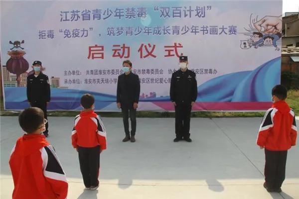 2020年6月20日,在第33个国际禁毒日来临之际,淮安区禁毒办会同团区委、妇联和禁毒志愿者一起,走进淮安区周恩来红军小学和关天培小学,开展“双百计划”青少年禁毒宣传教育活动,并启动了中小学生禁毒书画大赛,通过孩子们稚嫩的双手,将“远离毒品,珍爱生命”美好祝愿展现在一幅幅书画作品中,提高了孩子们的拒毒“免疫力”,还孩子们一片纯洁的蓝天。