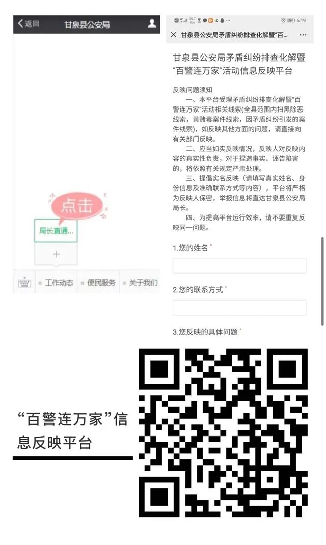 二是“两个结合”有创新。坚持传统警务与现代警务,线上警务与线下警务相结合,创新矛盾纠纷排查多元化解的方式方法,不断提升矛盾纠纷排查多元化解的效率和水平。传统、线下警务即通过开展进家庭、进社区、进村组、进企业、进单位、进校园“六进活动”,通过上门入户联系群众、发动治安信息员、日常治安管理、案件办理、巡逻防控、信息采集、与有关部门联系沟通等渠道,搭建密切联系群众的“连心桥”,使群众诉求可以多渠道反映,全方位掌握社情民意。“六进”过程严格落实“十必进”“五必访”要求,即生活困难群体家庭必进、重点人员家庭必进、特殊人员家庭必进、孤寡老人及留守儿童家庭必进、退役军人家庭必进、英烈民警家属家庭必进、离退休老民警家庭必进、治安防范重点部位必进、经营困难企业必进,服务对象企业必进。人大代表必访、政协委员必访、退役军人必访、信访人员必访、贫困人员必访。现代、线上警务即通过大力推进移动智能警务终端应用、微信公众号、“甘泉警苑”抖音号、局长二维码直通车等平台,实现线上与线下警务机制的连通,不断增强矛盾纠纷排查多元化解的科技含量。大力推进建设“指尖上的警务室”,各派出所全面组建辖区村组、社区、行业、单位“百警连万家”警民微信群,推行姓名+电话号码实名认证制度,把警务室建到群众指尖上,实现“民警宣传在群里,百姓说事在群里,警民沟通在群里”,不断丰富与群众交流的渠道。目前,全局共建立警民微信群142个,吸纳群成员23404人,推送转发各类安全防范、警务宣传类信息数万条,处理群众咨询数万次,梳理问题线索500余条。对问题线索逐一明确责任,落实措施,限时办结。