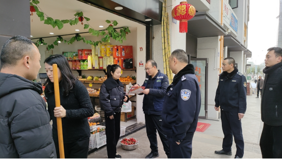 为商家宣传及发放《内江经济技术开发区管理委员会关于加强2024年春节期间烟花爆竹燃放安全管理的通告》