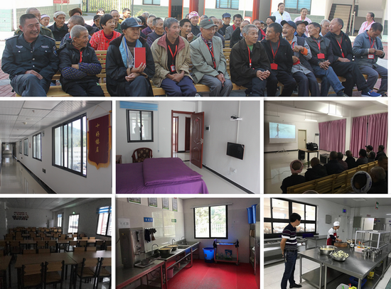 办公大楼一楼为厨房和餐厅。厨房设有标准的储藏间、粗加工间、主操作间、消洗间、更衣间等等,其加工设施设备均属现代化。办公大楼右边的综合楼内设有图书阅览室、娱乐室,房间内配备了暖气和电视机。图书室内设有报刊杂志之类;娱乐室设有农村老人喜欢的纸牌、花牌、象棋等。
