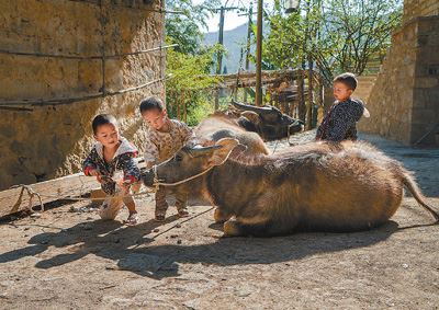 图为近日,阿者科古朴村落里,纯真无邪的孩子们与自家的水牛一起开心玩耍。