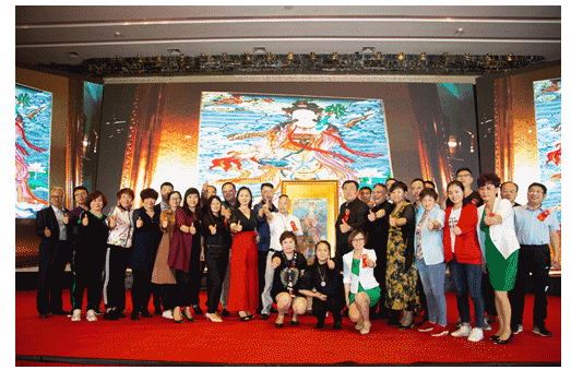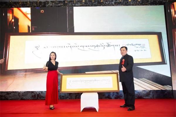 香港健乐客青岛运营中心总裁王涛女士(左一)高价拍得许刚先生(右一)珍藏艺术品——九世活佛赛赤呼图克图作品。助力洪门精武传奇,用实际行动支持民族运动的发展。